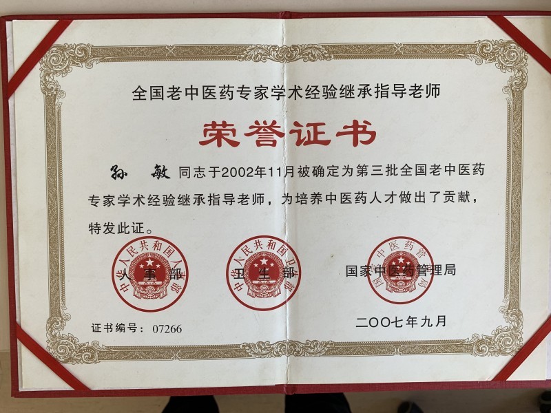 全國(guó)老中醫藥專家學術(shù)經驗繼承指導老師(shī)榮譽證書(shū)(2007)